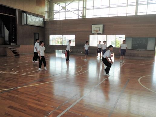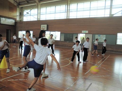 4限目には体育館でドッジボールをして盛り上がりました。1回戦は学校対抗、2回戦は混合チームで対戦しました。山代中学校に進学する仲間として、今後もこうした学習を行っていきたいです。