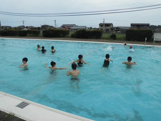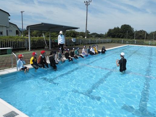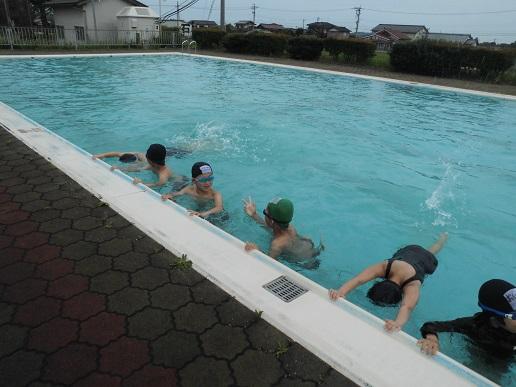 1,2年生のプールでの学習では、まずは水に慣れることを目標に取り組んでいます。体の力を抜いて大の字やまっすぐの姿勢、だるまさん、くらげの形で浮く練習をしました。水を怖がる子もおらず、みんなプールでの学習を楽しんでいました。