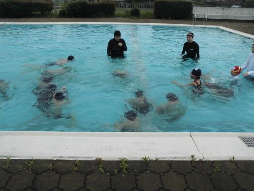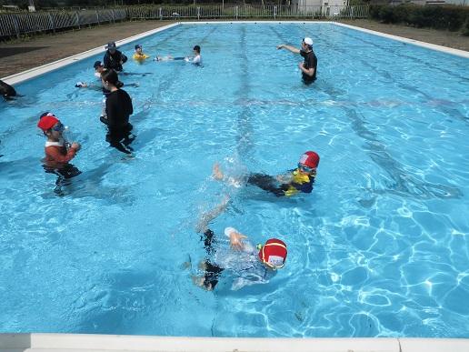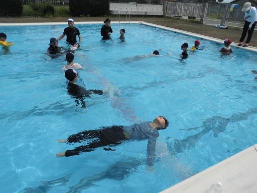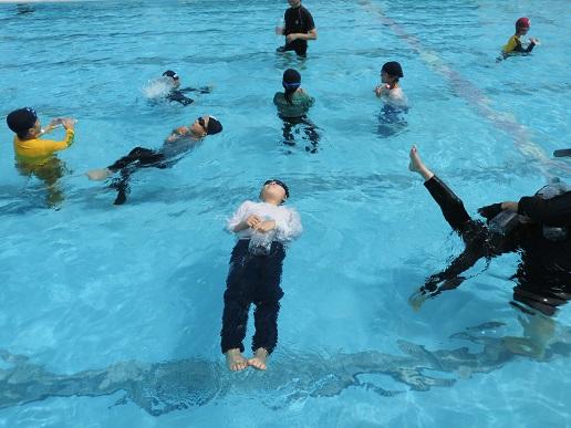 洋服を着て水の中に入った子ども達は、洋服の重さや動きにくさを実感していました。その後、着衣の状態でペットボトルを抱きかかえて浮いたり、仰向けになって大の字で浮いたりする練習をしました。