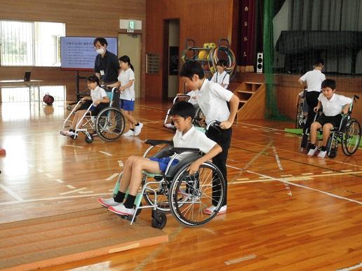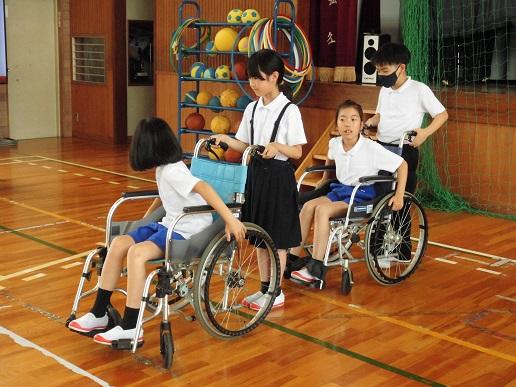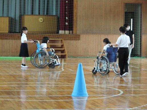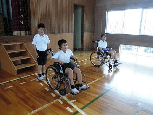 4年生は総合で福祉について調べています。今日は「やさしいまちづくり教室」ということで、車い椅子に乗ったり、車氏に乗っている人の介助の仕方を学んだりしました。