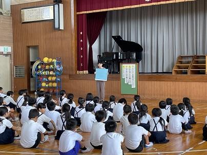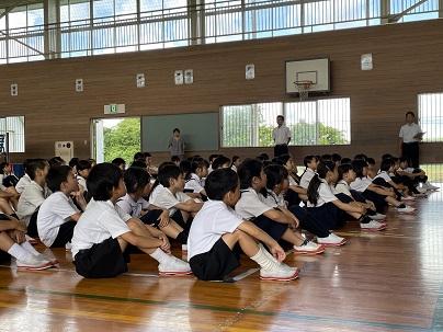 4月6日の入学式・始業式の日から約4か月、今日は1学期終業式となりました。式では校長から有意義な夏休みにするための「ちょくしっこ」の約束の話をしました。その後、生活のきまりや夏休みプールのきまりについて、それぞれの担当者から話をしました。子ども達は話す人を見て、真剣に話に耳を傾けていました。