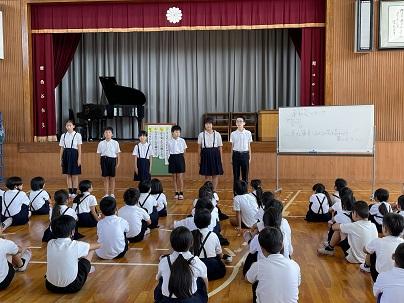 また、最後には児童会から運動会のスローガン発表がありました。今年のスローガンは「全力~真けん勝負!みんなで力を合わせて楽しもう~」2学期に入ると練習がスタートします。
