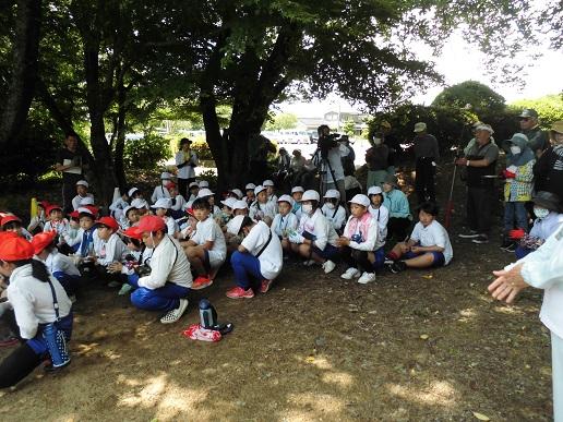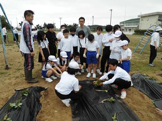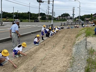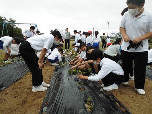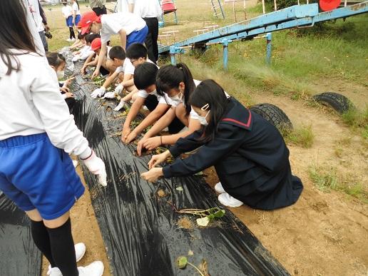 長休みに4つのファミリーに分かれて植えました。事前に農協の方から、植え方のポイントを教えてもらった6年生が先生となって、下学年に声をかけながら各ファミリー、協力して行いました。これから、水やりも曜日ごとに学年で分担して行います。秋に収穫して焼きいもを行うのが楽しみです。