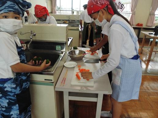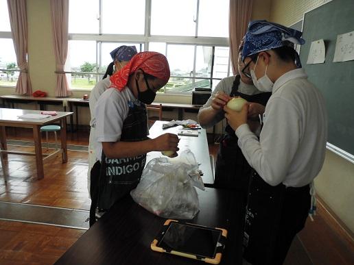 今日5,6限目に家庭科の学習で「いろどり野菜いため」の調理を行いました。玉ねぎ、にんじん、ピーマンを使った野菜ためです。野菜ごとに火の通りやすい切り方や炒める順番等を考えながら作りました。