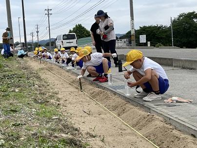 交通事故でなくなった子供のご遺族から、生前子供が大切に育てていたヒマワリの種を引き継ぎ、そのヒマワリの種をまき開花させることで、命の大切さを学び、交通事故防止に努めようよいう取組です。公民館長さんが中心となって準備を進めていただき、この日は警察の協力のもと1人10~20粒の種を森町東の交差点のほど種をまきました。夏にはたくさんお花が咲いて、運転手や歩行者への注意喚起に役立ってくれることと思います。