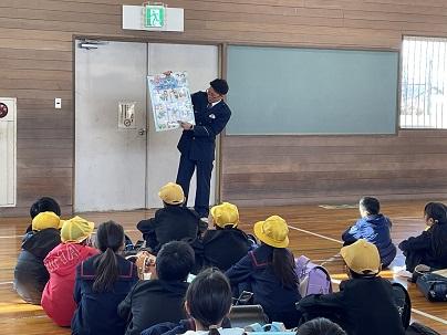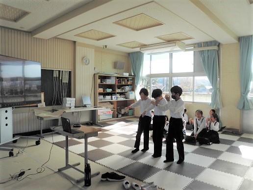 5限目に体育館非常口より不審者が侵入したという想定で訓練を行いました。不審者侵入の第1報の後、先生の指示に従い集まって次の指示を待ち、避難の放送で素早く体育館に集まることができました。その後、大聖寺警察署の方から「いかのおすし」の話や実際に後ろから襲われた時の対応を練習しました。放課後には、教職員対象にさすまたの使い方や不審者への対応のポイントを教えていただきました。