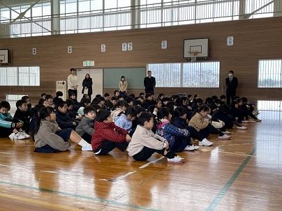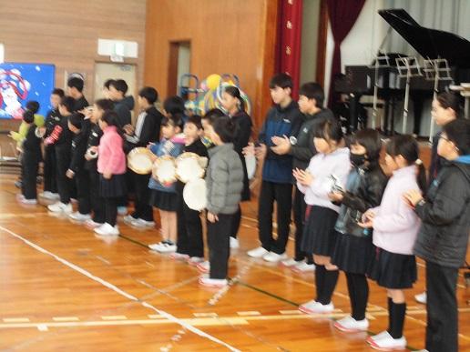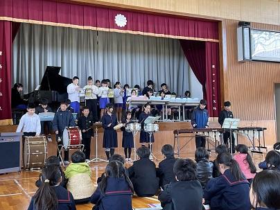 コロナ禍の影響で6年生は、一度も加賀市の音楽会に出演することができませんでした。そこで、日頃の音楽の学習の成果を発表する場として、校内での音楽会を開催しました。3年~6年の各学年の合奏発表のあと、低学年の打楽器のリズムにのって全校で「あわてんぼうのサンタクロース」を合唱しました。全校で音楽を楽しむひとときとなりました。