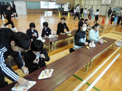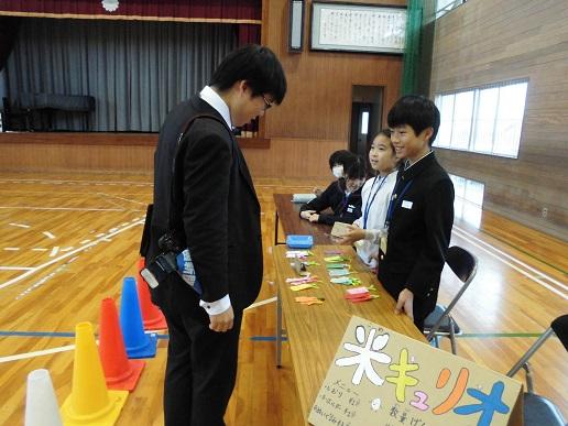 5年生が総合の学習で学んだことを生かして、米フェスタを企画し、この日の長休みから3限目に全校児童を招待してくれました。4種類のお米の食べ比べコーナー、米ゲームコーナー、お米のキャラクターのしおりやキーホルダーの配布コーナーやお米キャラクターとの記念撮影コーナーの4つのコーナーがありました。いろいろなアイデアのある米フェスタを全校みんなが楽しむことができました。