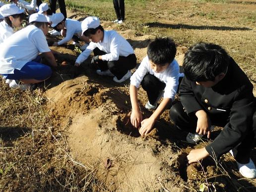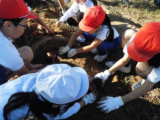 今日は朝休みに赤と白のファミリー、勅使っ子タイムに青と黄のファミリーがイモほりをしました。今年の夏はとても暑く、雨の降らない日も多かったので、どれぐらい実がなっているか心配しましたが、大きいおイモがゴロゴロでてきて子ども達は大喜びでした。11月には全校焼きイモパーティーをする予定です。