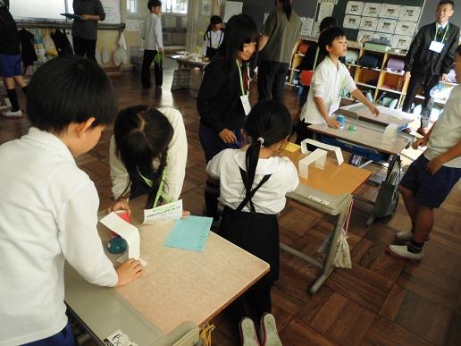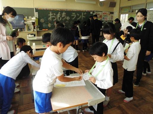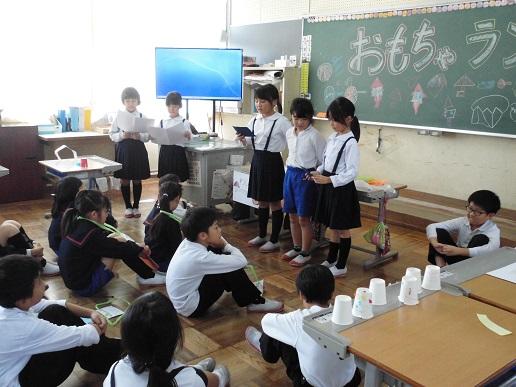 2年生は生活科の学習で、風や磁石、ゴムの力を使ったおもちゃづくりをしました。そして、それを使って遊ぶ4つのコーナーのあるおもちゃランドを作り、1年生や3年生、先生方を招待しました。各コーナーでは、遊び方の説明をしたり、カードにシールをはったりといった仕事を友達と協力してテキパキと行っていました。どのおもちゃも工夫のあるもので、参加したみんなから「おもしろかった」「またやりたい」と言われ、2年生も満足そうでした。