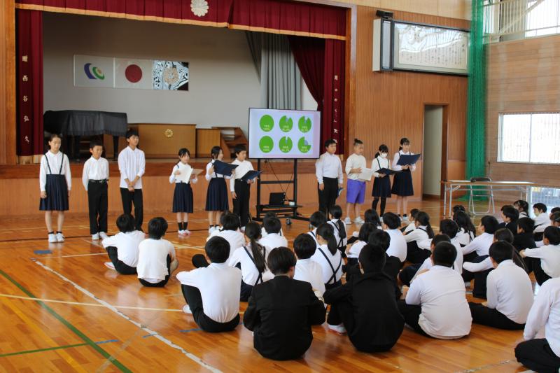 今日3限目に全校であいさつについて考える授業をしました。事前の子ども達のアンケート結果を提示したり、キッズサポーターの方々のご意見を知らせたりしながら、これから一人ひとりがどのようなあいさつをしていきたいかカードに書いて発表しました。気持ちのよい挨拶は相手も自分も元気にします。勅使小学校が笑顔あふれる元気いっぱいの学校にするため、まずはあいさつから始めましょう。