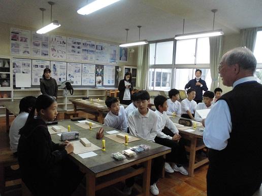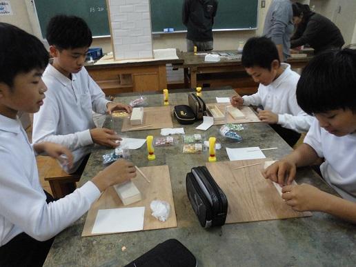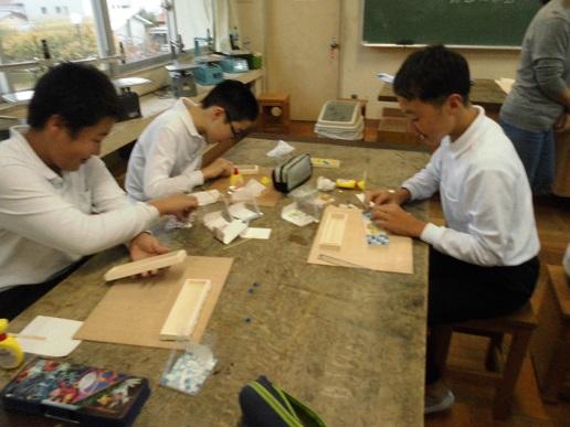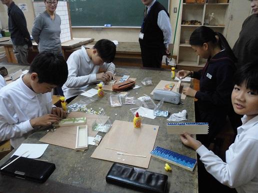 ものづくりに関する高い技術を持つマイスターの方に来校いただき、プロの技を見せていただいたり教えていただいたりして、ものづくりの面白さや楽しさを感じ、興味をもってもらおうという企画です。今日は、タイル貼り職人の方に来ていただき、本当のタイル貼りの体験のあと、タイル貼りの小物入れを作りました。みんな集中してタイルを貼って、素敵な作品を完成させていました。