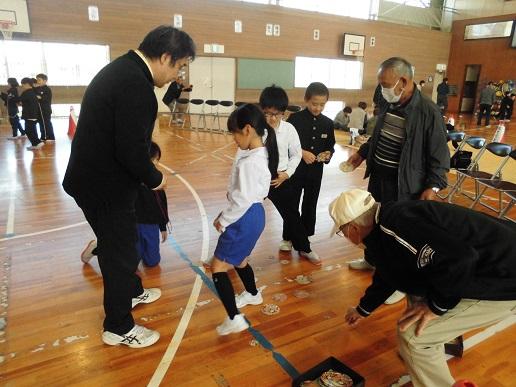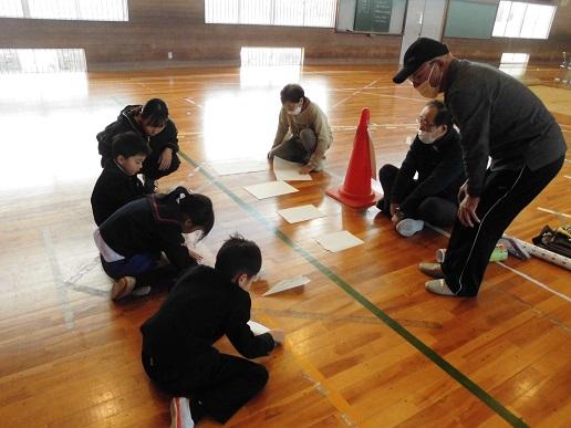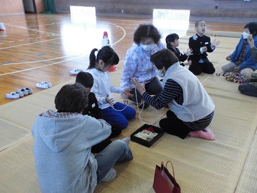今日、福寿会の皆様に来校いただき、昔遊びの会を開催しました。お手玉、あやとり、めんこ、こま、紙飛行機等、昔の子ども達が楽しんでいた遊びを体験しました。福寿会から来ていただいた12人のおじいちゃんやおばあちゃんが遊び方のコツを分かりやすく教えて下さり、子ども達も試行錯誤しながら楽しんでいました。