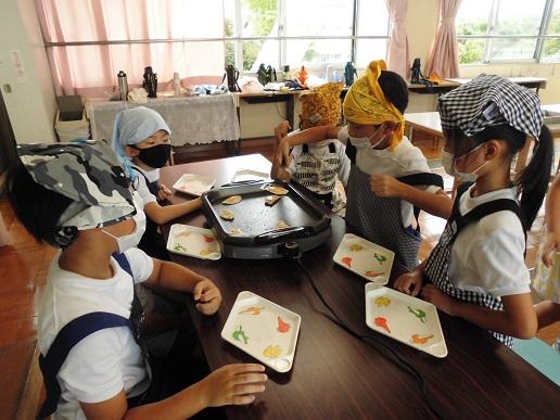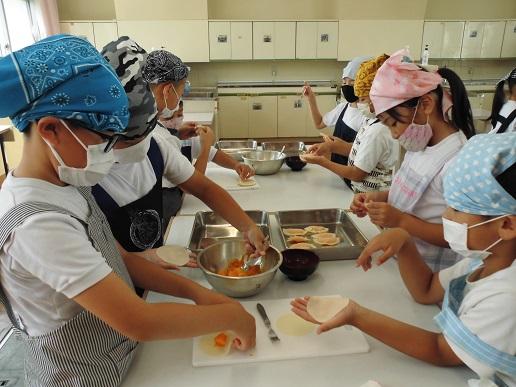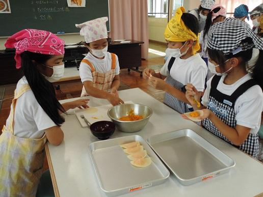 生活科で育てたカボチャを使って、かぼちゃカレーとかぼちゃパイを作りました。カレーに入れる玉ねぎを細かく切ったり、餃子の皮につぶしたかぼちゃを入れて包んだり、それをホットプレートで焼いたりといろいろな作業に一人ひとり真剣に取り組んでいました。かぼちゃパイは5限の全校綱引き練習後に全クラスに届けて、とても喜ばれました。