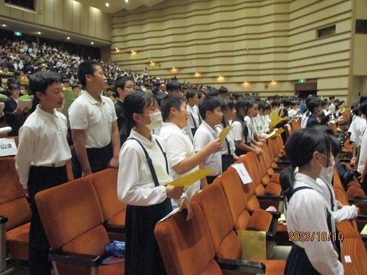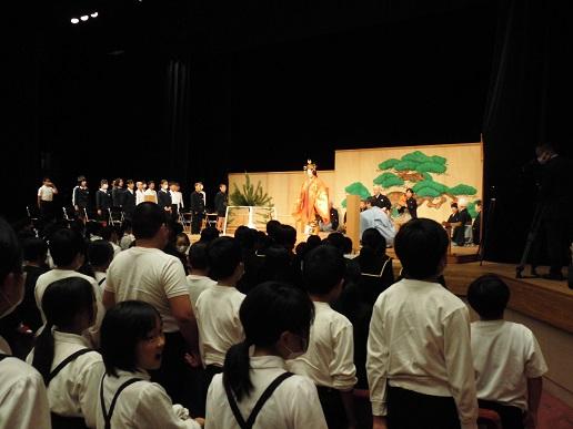 今日、加賀市文化会館に市内全小学校の5,6年生が集まり、千人謡の会が開催されました。金沢能楽会の皆様による狂言の鑑賞のあと、能「羽衣」の中の謡を全員で行いました。千人の謡の声がそろうのか心配でしたが、これまでの練習の成果を発揮し、力強い謡の声がホールに響きました。子ども達にとっては、とても貴重な経験となりました。