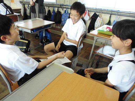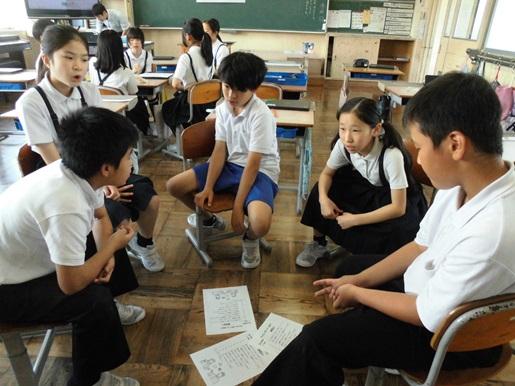 昨年度からスタートしたちょくしっこトーク。ペアやグループでお題について自分の意見や理由を話したり、友達の話に質問や感想を返したりということを通して、いろいろな人とかかわる力や対話力を育むことを目指して、毎週水曜日の朝タイムに全クラスで行っています。