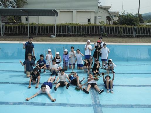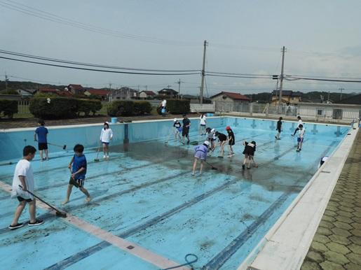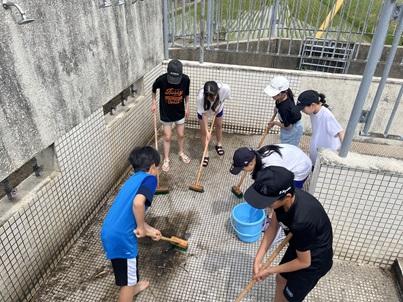 今日の午後、5,6年生がプール掃除を行いました。4つのファミリ―に分かれて、まずはトイレやシャワーコーナー、プールサイドをきれいにした後、プールの中の掃除に移りました。プールを4分割してファミリーごとに担当の範囲をたわしやデッキブラシでこすって泥汚れを落としたり、落ち葉や枯れ枝を取り除いたりしました。1時間ほどの作業でしたが、みんなが力を合わせた結果、とてもきれいになりました。プール開きが待ち遠しい。
