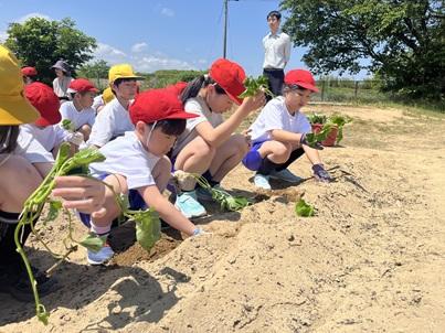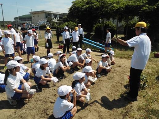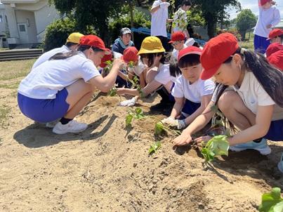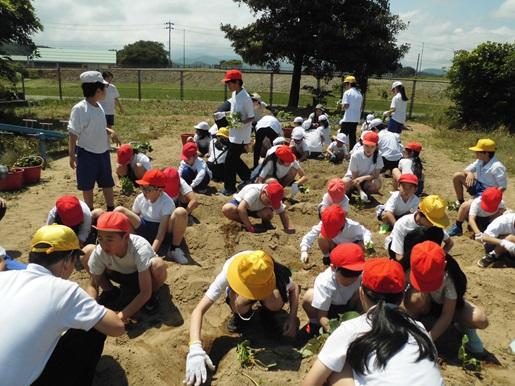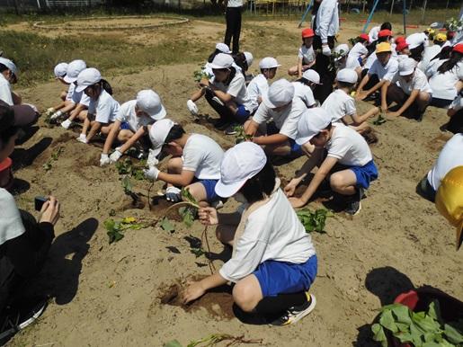 勅使っこタイムに全校でさつまいもの苗を植えました。ファミリーごとに6年生が植え方を説明した後、1人3~4本の苗を植えました。高学年が低学年に植える深さや土のかぶせ方等を教える姿が見られました。これからは、全校で水やり当番を決めて水やりをして、秋のさつまいもパーティーを楽しみにお世話をしていきます。