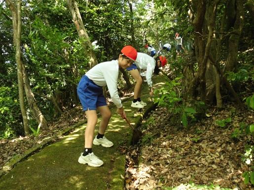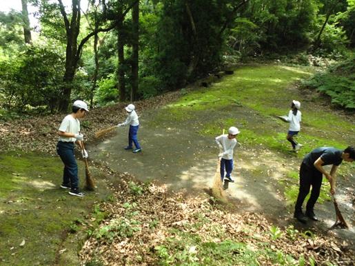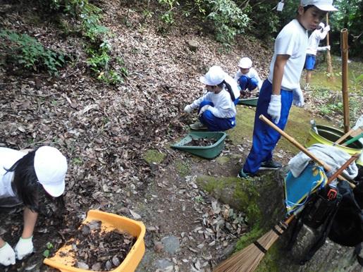 今日、福寿会の皆様の御協力のもと法皇山の清掃作業を行いました。縦割りの8グループに分かれて「学年関係なく声をかけ合い、仲良く協力しよう」をめあてに、それぞれの担当場所の枯れ葉集めや溝掃除をしました。40分ほどの時間で見違えるほどきれいになり、子ども達も満足した様子でした。