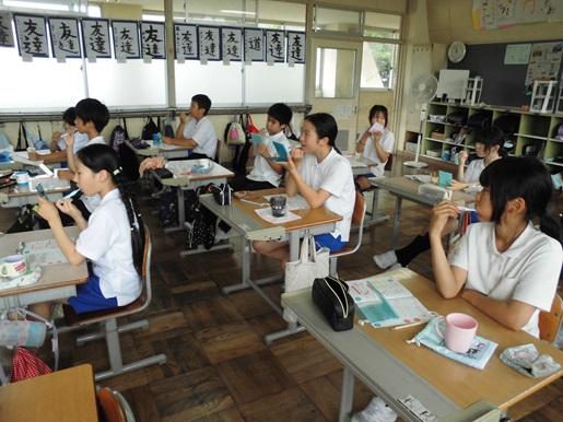 今日は2年生で実施しました。鏡を見ながら、歯垢の溜まりやすいところをチェックし、歯磨きにポイントを学びました。