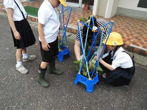 1年生が毎朝水やりをして、その成長を楽しみにお世話しているアサガオ。今日のような暑さにも負けず、ぐんぐんとつるを伸ばし始めました。そこで、今日の5限目に肥料をやり、支柱をたてました。2人一組となって、助け合って支柱をつけることができました。この支柱につるをまきつけながら、さらに大きくなっていくのが楽しみです。