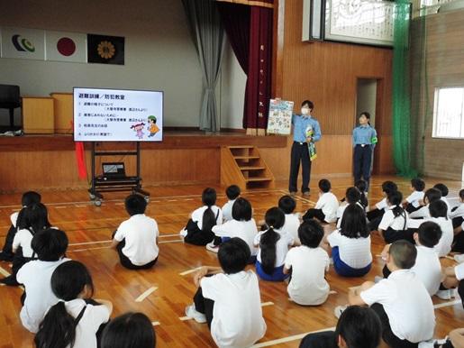 2025年5月27日 15時43分今日5限目に、校内に不審者が侵入したという想定で避難訓練を実施しました。今月初めには、東京立川市で実際に不審者により教職員がけがをするという事件が起きています。子どもと教職員の命を守るための行動について、警察署員の方にいろいろ指導していただきました。避難訓練終了後には、体育館で登下校時の不審者対応について「いかのおすし」や「ひよこのやくそく」等の話をしていただきました。さらに、放課後には教職員対象に、校内に不審者を入れないためのインターホン対応や新しいさすまたの使い方等についての研修会を開きました。