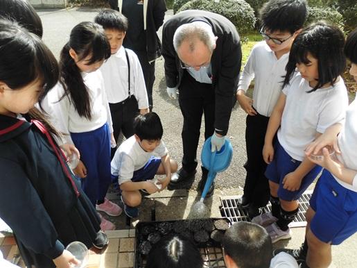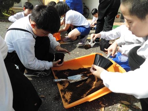 春らしい暖かい日が続くようになりました。今日4年生は理科の学習で、ヒョウタンの種をまきました。種の観察をした後、玄関前で1人1ポットにヒョウタンの種を1粒づつまきました。芽が出て成長し、ヒョウタンができるのが楽しみです。