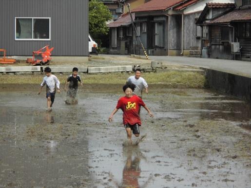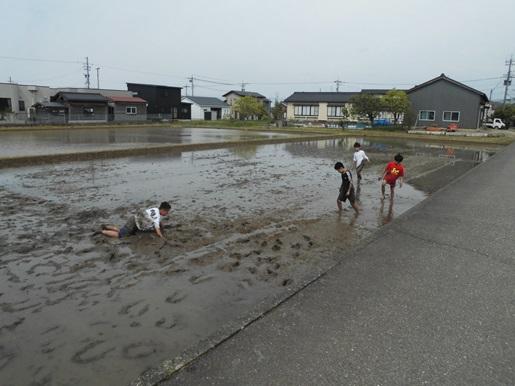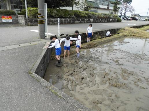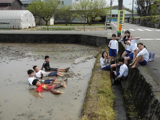 毎年5年生は総合の学習で米つくりに取り組んでいきます。今日はまず、田植えに備えて田んぼに入ることを体験しました。ぬるっとした感触に始めは足を入れることができない子もいましたが、次第に慣れて、特に男子は走ったり寝転んだりしていました。田植え本番が楽しみです。