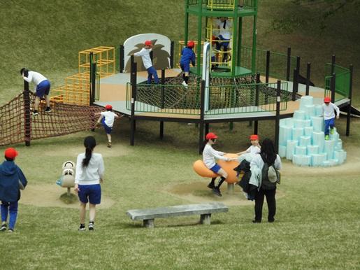 今年度初めて全校での遠足を実施しました。これまで、4月に1年生を迎える会・ファミリー開き・全校遊びの会等を学校で行っていました。そうした活動と遠足を合体させて実施することにしました。曇り空の下での出発となりましたが、中央公園では雨に濡れることもなく、全校こおりおにごっこやファミリーごとの遊具遊びを楽しみました。