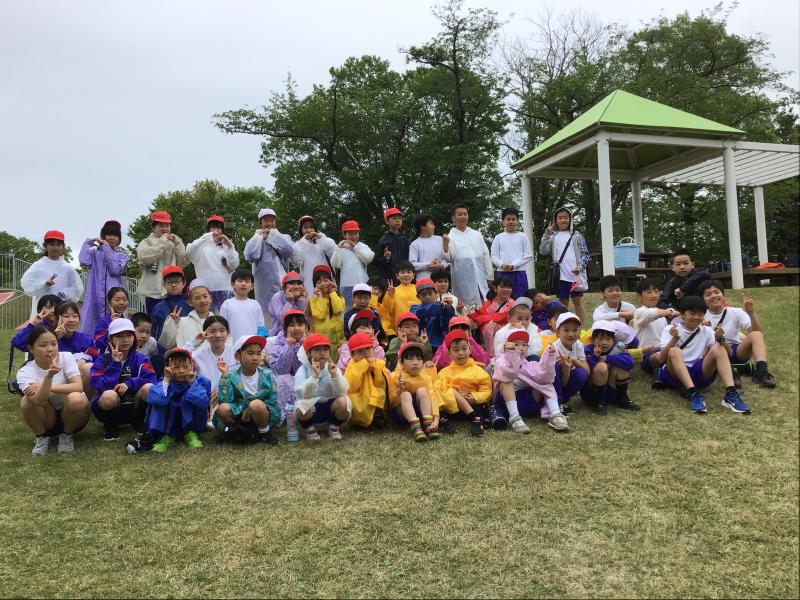 ぽつぽつと雨が降り始めた頃には、旧三木小学校体育館に移動してファミリー開きやじゃんけん列車、ドッジビー、1年生へのインタビュ―等を行い、その後昼食&おやつタイムと、6年生が進行しながら予定をすべてを実施できました。学校に戻ってからの振り返りでは、みんな目標とした「史上最高の遠足」ができたと答えていました。