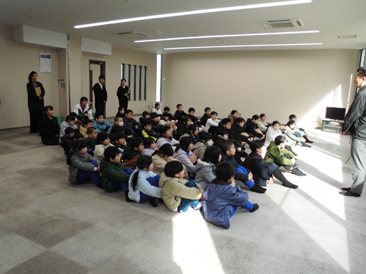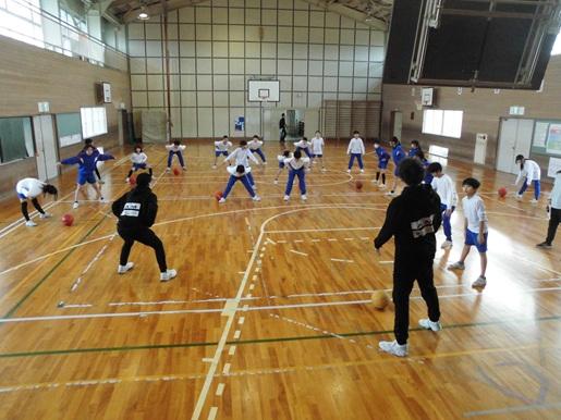 金沢市をホームタウンとするプロバスケットチームの金沢武士団のコーチ2人が来校し、5,6年生対象にスポーツ教室を開催しました。基本姿勢からはじまり、パスやドリブル、シュートのポイントを分かりやすく説明していただきながら練習しました。最後にはコーチ2人が児童4チームと順番に試合をしてくれました。遠いところから見事にシュートを決めるプロの技に、子ども達からは歓声が上がっていました。
