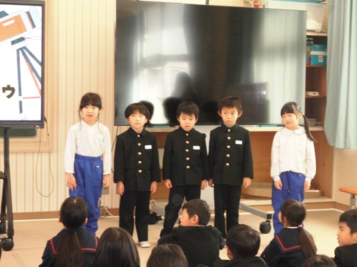 1年生が、来年度入学予定の園児を招待して開催しました。前日までの計画・準備、当日の進行・発表等5人で協力して、園児たちの楽しんでもらおうとがんばりました。