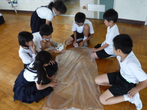 6月28日㈮に、総合の学習で、津幡町まちなか科学館 館長の小林先生をお招きして、『科学にチャレンジ!科学のおもちゃを作ろう!』と題し、風の力で回るこまやブーメラン、熱気球を作りました。子供たちは、友だちと協力しながら一生懸命作り上げ、思いきり楽しんで遊ぶ姿が見られました。