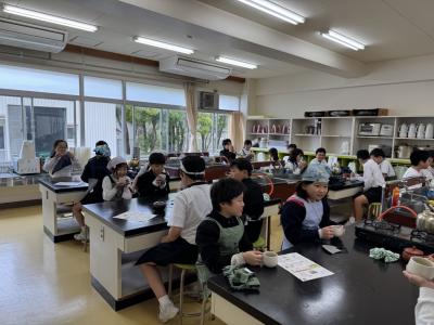 家庭科室の使い方も初めてのことばかりですが、先生の話を聞き、班のみんなで協力して、
