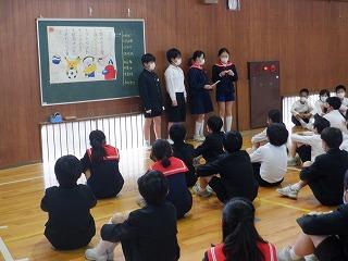 最後に、読書賞の表彰がありました。5年代表児童が学校長から賞状を受け取り、全校児童に向けて読書のよさを伝えました。