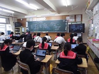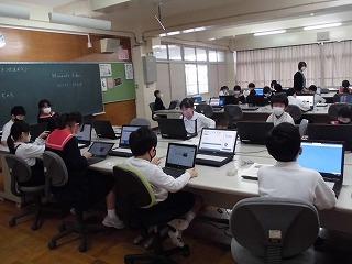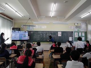 算数の時間に正多角形を学習している5年生。3月14日(火)の算数の時間は、担当の先生とPCサポーターと一緒に、プログラミングで正多角形を描く学習をしていました。描きたい図形にするには、どんな命令を出せばよいか、曲がる角度や向きを考えながら取り組んでいました。
