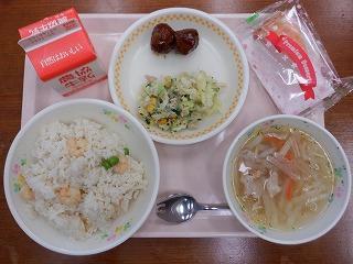 6年生にとって最後の給食となる3月16日(木)の献立は、えびピラフ・ミートボール・コールスローサラダ・コンソメジュリアンに加え、お祝いケーキは豪華なミルクレープでした。