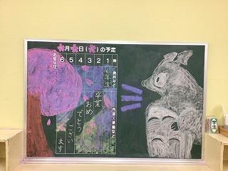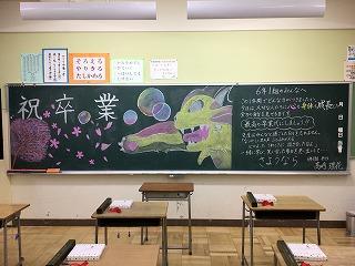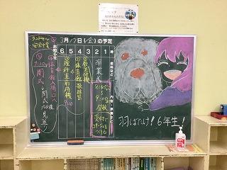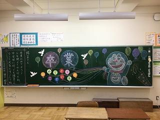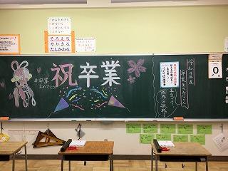 卒業式準備の6年教室飾り担当の5年生が、お祝いの気持ちを込めて黒板アートに挑戦しました。3クラスとも素晴らしいアートで、担任からのメッセージも添えられていました。保護者の皆様に見ていただけなかったのは残念でしたが、6年生は、きっと喜んで見てくれたことと思います。6年生の皆さん、卒業おめでとう!