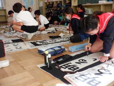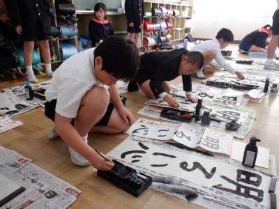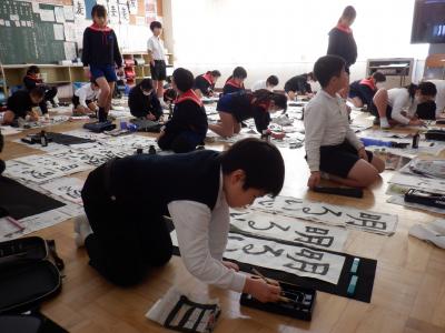 4年生は、1組が書写の時間に書き初めの練習をしました。課題は「明るい心」です。