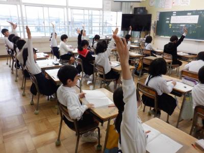 分数と小数の関係について学習しています。問題の答えが分かった子どもたちは、元気よく手をあげています。