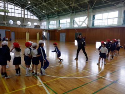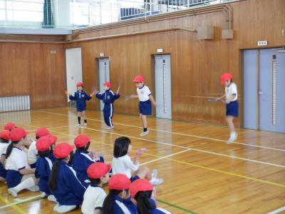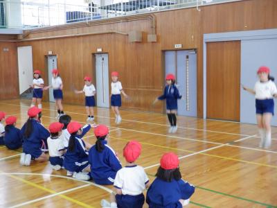 授業のはじめは、短なわや大なわをしています。みんな一所懸命に跳んでいました。