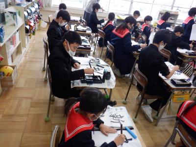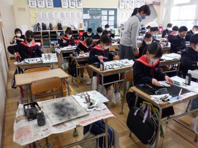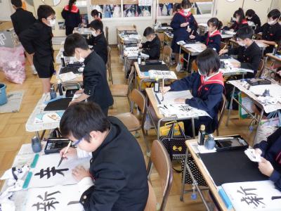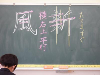 書き初めの課題は「新しい風」。「はね」や「そり」など難しい部分が多く、今回は漢字を中心に練習です。