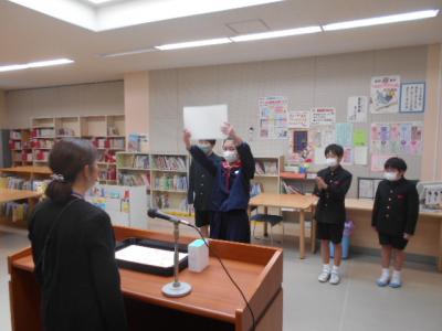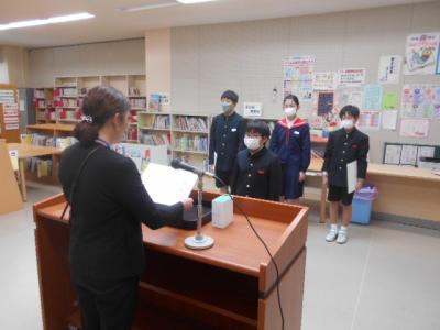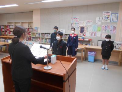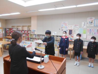 2学期の読書賞、県硬筆書写コンクールは、入賞した児童を代表して6年生が賞状を受け取りました。
