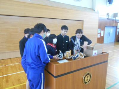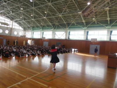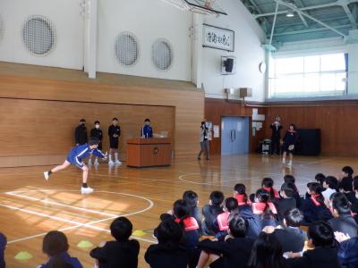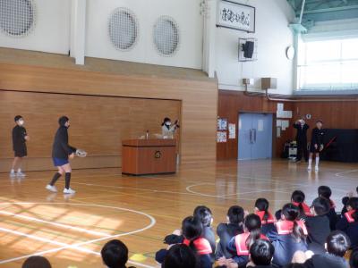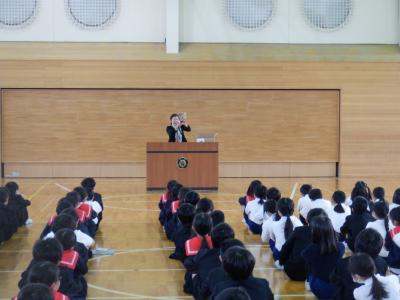 16日(火)長休みの終盤、校長先生が体育館でグローブを紹介してくれました。