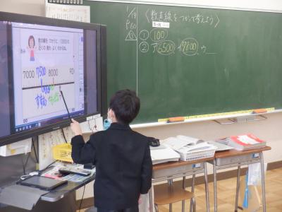数直線上の数はいくつを示しているか、答えの発表だけでなく、答えを導き出した理由を発表しています。