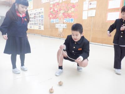 プレールームでは、竹とんぼ、こま回し、羽根つきを行いました。