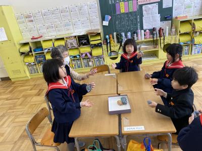 めんこ、お手玉、あやとり、だるま落としの遊びは、教室で楽しみました。