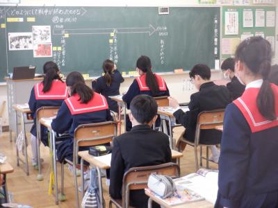 1組は社会の授業。どのように終戦をむかえたのか学習しています。