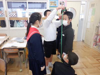 「1mの量感」を確かめるために、ものさしを使わずに、グループで1mの長さを考える活動もしました。