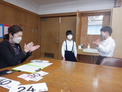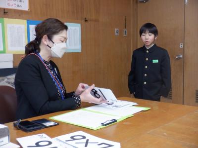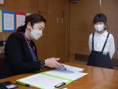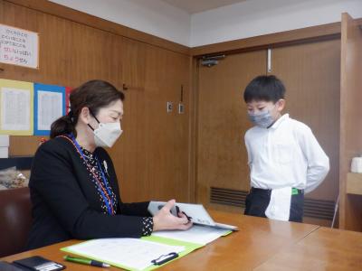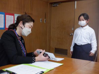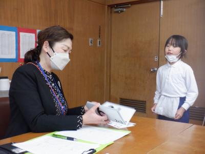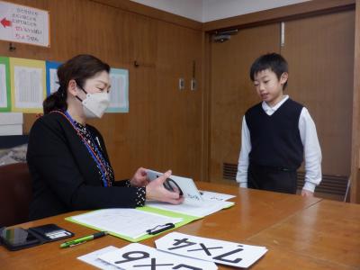 担任の先生から九九の合格をもらった2年生が、校長室で九九検定に挑戦しています。